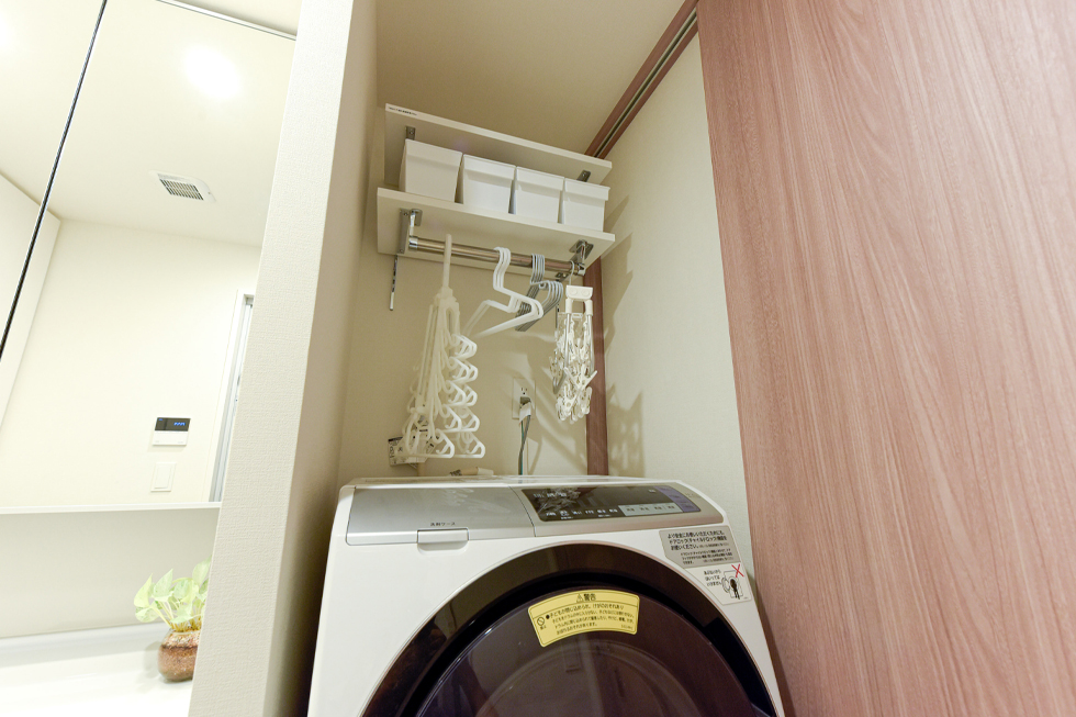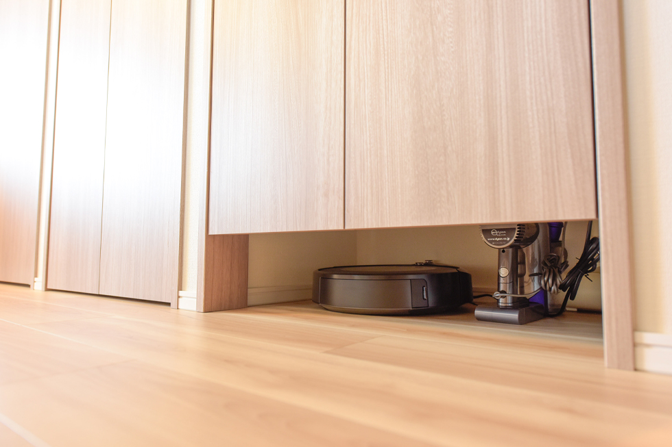 3歳のお子様がいるとは思えないほど綺麗に片付いたA家。リビングと隣の洋室を一体化して使うことで、専有面積以上の広さとゆとりを感じます。「標準仕様の壁のアクセントクロスやキッチン天井の装飾など、細かい部分にこだわった造りが気に入っています。収納もよく考えられていて、大容量のリビング収納の下部にロボット掃除機の出入り口が設けられていたり、洗面室にも、洗濯カゴまでしっかり収まる大きなリネン庫や、ハンガーパイプ付きの洗濯機上収納が設置されています。しまうモノを想定して収納が作られているので、ストックも含め整理しやすく使い勝手が抜群です。」