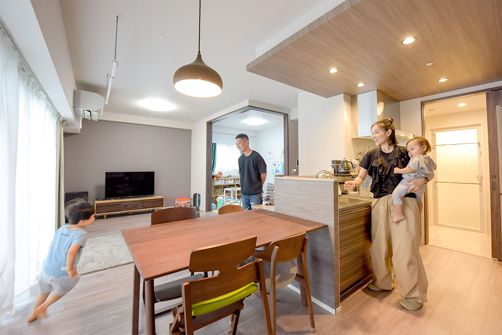 「子供たちがもう少し大きくなるまで、ソファは置かないつもりです。」というK家では、リビングと洋室をつなげた大空間で、お子様たちがのびのびと遊んでいます。「この間取りは、遊んでいる子供たちの様子をキッチンから一目で見渡せるのがいいですね。それから、居室、キッチン、洗面室、お風呂、廊下が、スムーズに行き来できるようにぐるっとつながっているので、家事が効率良くこなせます。」と奥様。機能的な家事動線を確保した回遊性のある間取りは、奥様だけでなく元気いっぱいのお子様たちにとっても嬉しい間取り。行き止まりがなく伸びやかにつながった空間を、ぐるぐると楽しそうに走り廻っています。