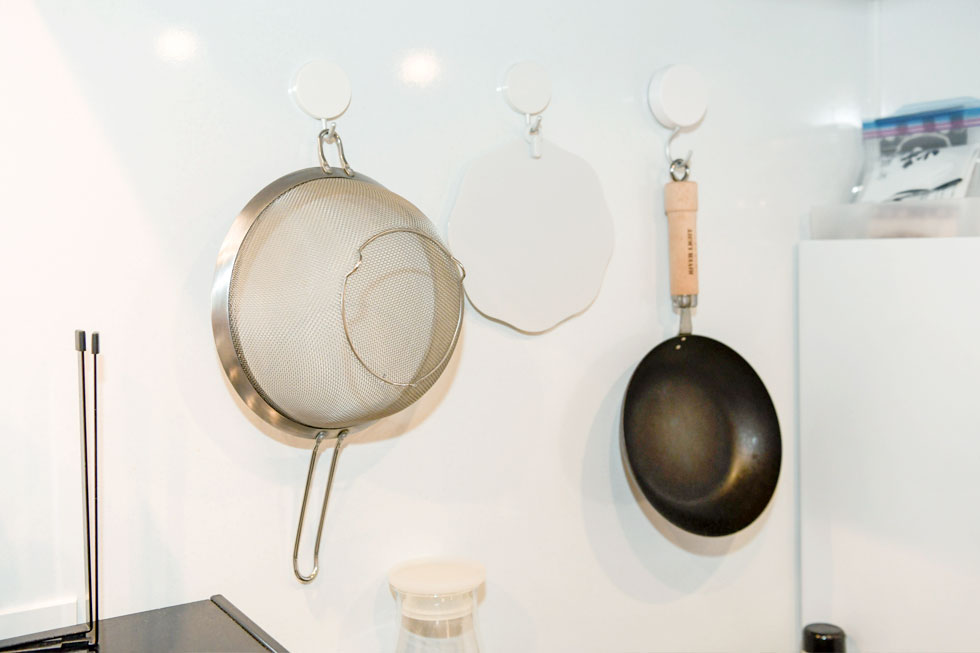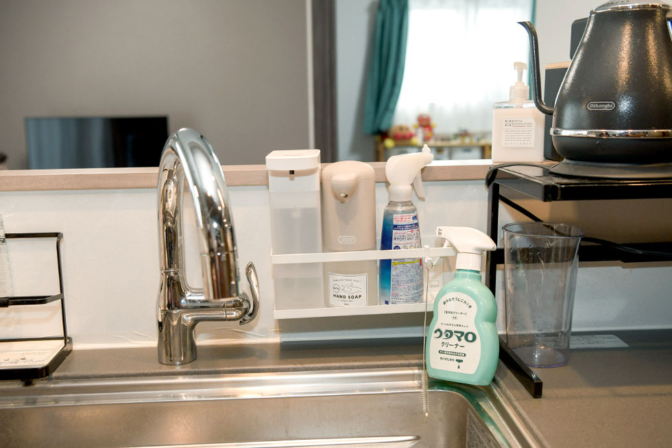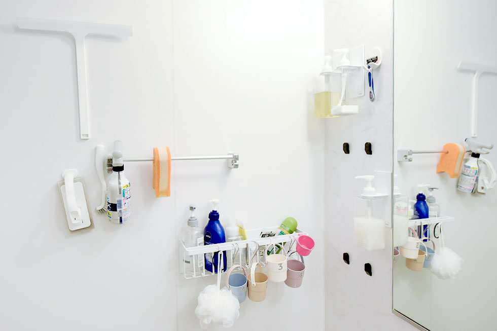 「キッチンカウンターの立上り壁が少し高めなので、程良い目隠しになり、マグネットグッズも便利に使えます。」という奥様は「浮かせる収納」の達人。立上り壁はもちろん、レンジ廻りやお風呂の壁、玄関ドアなどにも様々なマグネットグッズを使って、上手に整理整頓されています。「壁面が有効活用できるだけでなく、モノが浮いていると掃除もラクです。」という奥様、引越してから掃除のストレスが減ったと言います。「例えば洗面ボウルや便器にフチがないなど、各所の掃除がしやすいので、気が付いたときにサッと手軽に掃除ができます。さあ掃除するぞ、と意気込まなくても良いので、気持ちが随分ラクになりました。」
