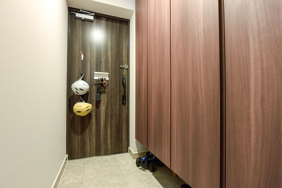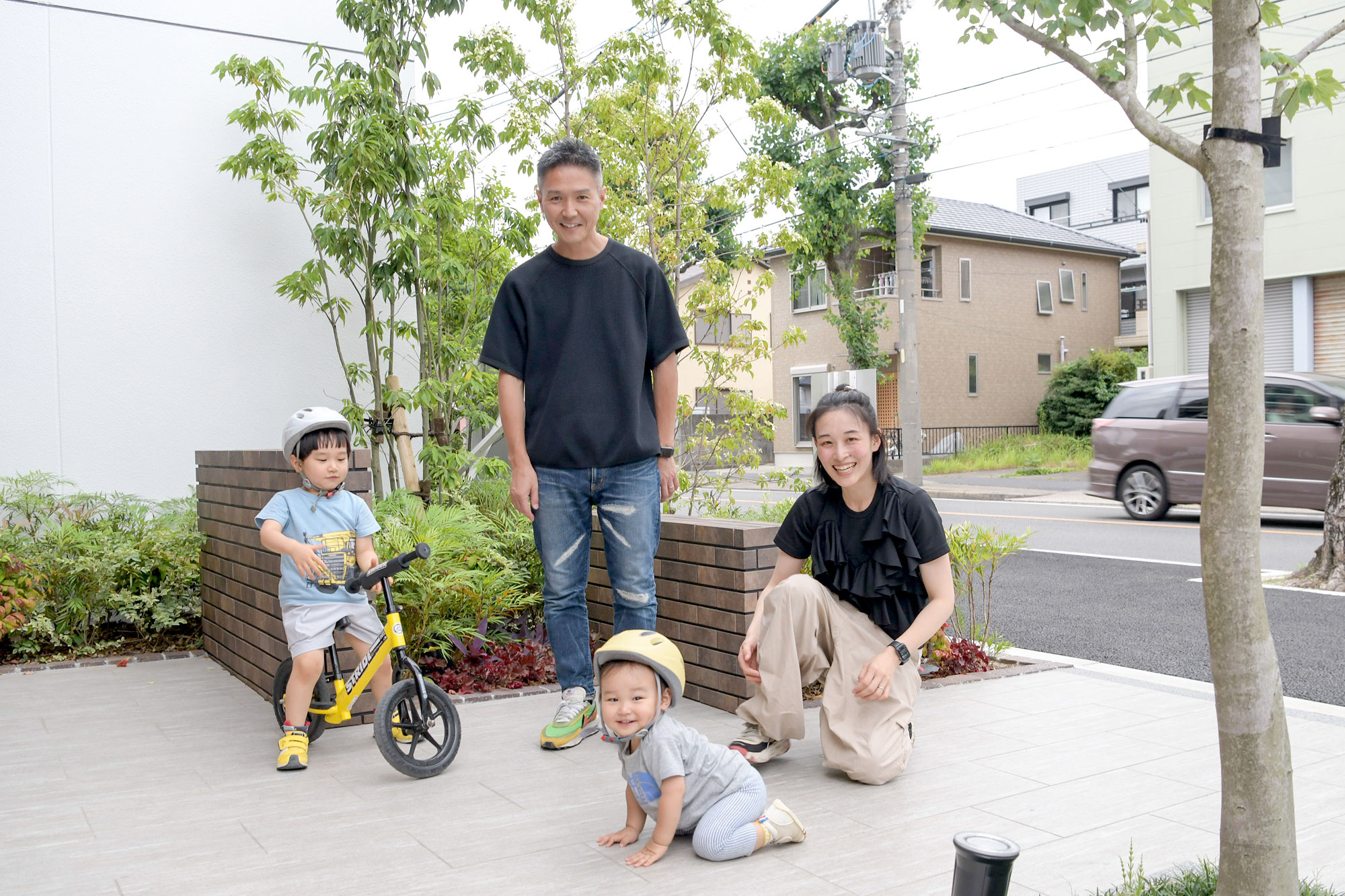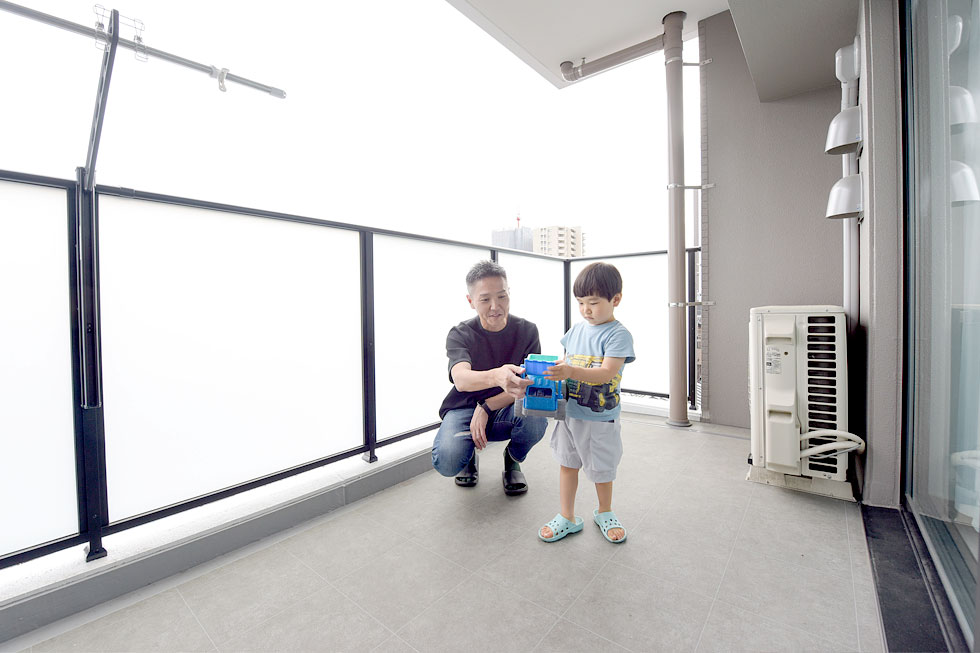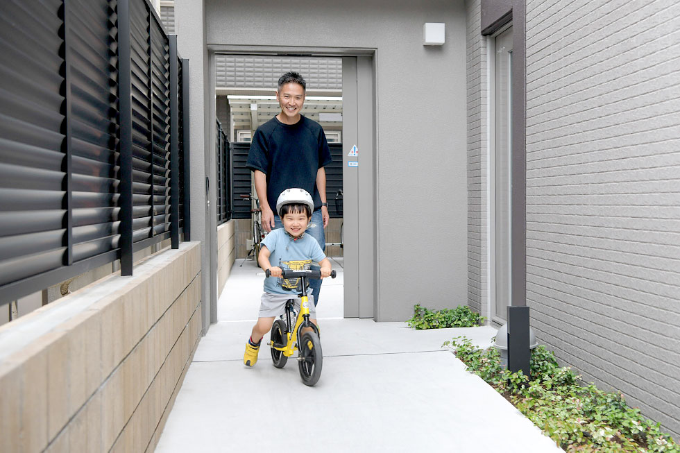 K家のバルコニーは奥行2m。「バルコニーが広いので、水と食料を入れた非常用備蓄BOXを置いています。夏には、ちょっとした水遊びもできそうです。」というK家定番の休日の遊び場は、近くの名城公園。朝5時半に起きて、朝食のあと、ご主人はランニングをしながら、奥様とお子様は電動自転車で出掛けるそうです。「三人乗りの電動自転車と子供用のストライダーを持っているので、ラック式の自転車置場ではなく、サイクルポートで良かったです。出入り口もカギを持っているだけで開く自動扉なので便利です。」子育てを第一に考えた愛情いっぱいのマイホームで、この先二人のお子様は元気にすくすくと成長されていくことでしょう。