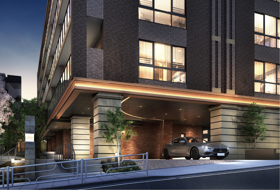 私の一番のこだわりは外観です。横浜という都市の歴史を象徴する3つの歴史的建造物をモチーフとして採用しました。「キングの塔」の意匠をエントランス側外観と車寄せに、「ジャックの塔」を外壁色および共用部の天井装飾・照明に。「クイーンの塔」を共用部の洋館風アーチデザインに取り入れています。周辺環境を踏まえて、エントランス側外観は、濃いブラウンの縦ラインを基調にして、クラシックな洋館の趣を演出。さらにエントランスホール内や車寄せにはガス灯をイメージした照明、外構の水景は地名の由来となっている「滝ノ上」(本敷地南側にある「白滝不動尊」の滝)をイメージ演出しました。そしてソメイヨシノやヤマボウシなど、「根岸森林公園」とつながる植栽を配して、四季折々に楽しめる外構を計画しました。