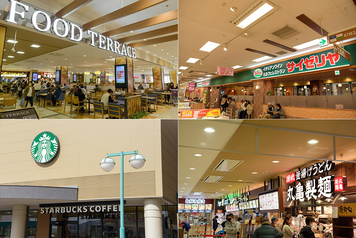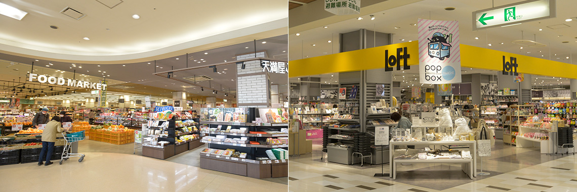 「ポートプラザ」の「天満屋ハピータウン」には、新鮮で高品質な食材を豊富に取り揃えたスーパーマーケットや食品館、有名生活雑貨専門店、人気のカフェなどが入店。「ゆめタウン福山」には、レストラン、多彩な飲食店が軒を連ねる「フードテラス」などの他に、ファッションやインテリアのお店があり、買い物から食事まで日々の暮らしを幅広くサポートしてくれます。
