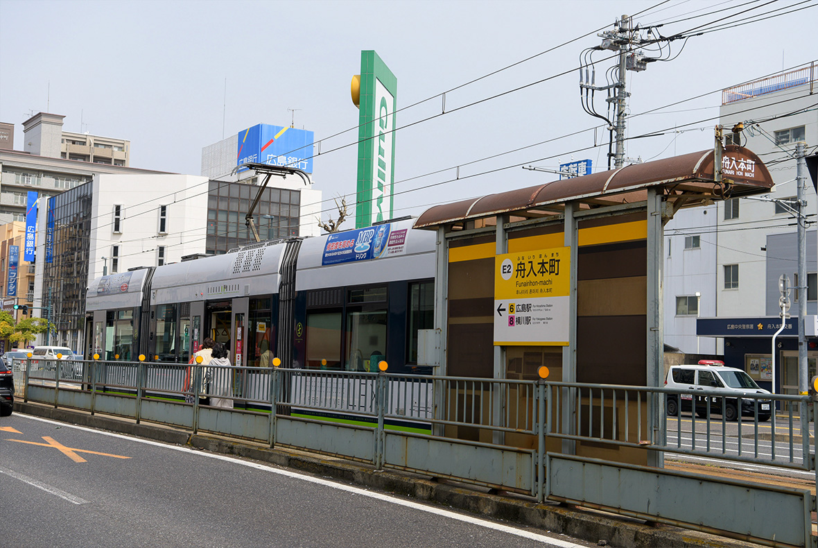 スタート地点は、広島電鉄江波線の「舟入本町」電停。平日は「広島」駅行が78本、「横川」駅行が74本停車し、「紙屋町」までは約15~17分程でアクセスできる便利な電停です。周辺には多彩な買い物施設や飲食店、金融機関、病院などが集結。東側には本川(旧太田川)、西側には天満川が流れ、豊かな自然が四季の移ろいを感じさせてくれます。