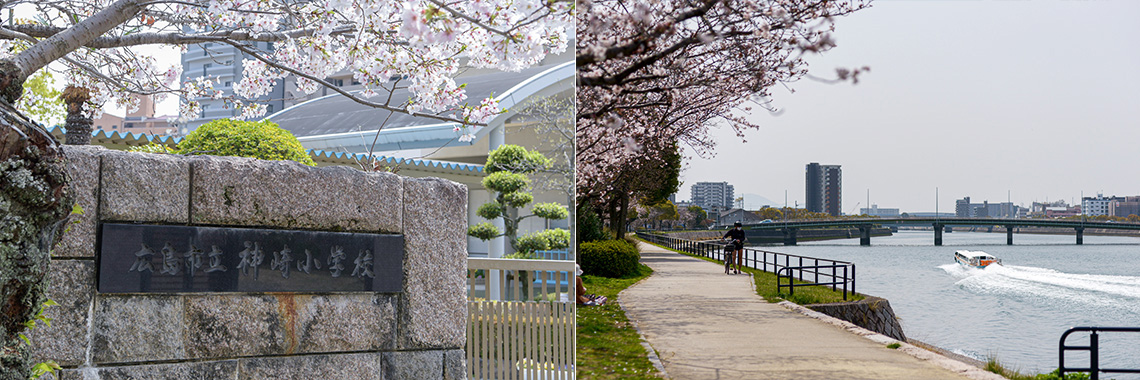 我が国初の鋼ローゼ橋(アーチを用いた橋)「住吉橋」の下を、平和記念公園と宮島を結ぶ「ひろしま世界遺産航路」の高速船や、「ひろしまリバークルーズ」の遊覧船が行き来する本川。宮島厳島神社の祭礼行事「管絃祭(かんげんさい)」の船も本川を巡航します。川沿いには学区の「広島市立 神崎小学校」も。創立100年を超える歴史ある小学校です。
