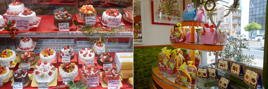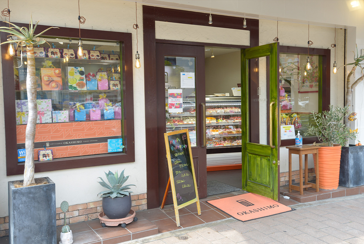 電停すぐ近くの「pâtisserie OKASHIMO(お菓子茂)」は創業90年のお菓子屋さんです。定番のケーキから、お土産にぴったりの焼き菓子まで、多彩なラインナップの商品が店頭に並んでいます。素材ひとつひとつにこだわり、厳選されたものだけを使用。特にフルーツは、パティシエが直接農家さんに伺い、本当に美味しい果物を目利きしています。