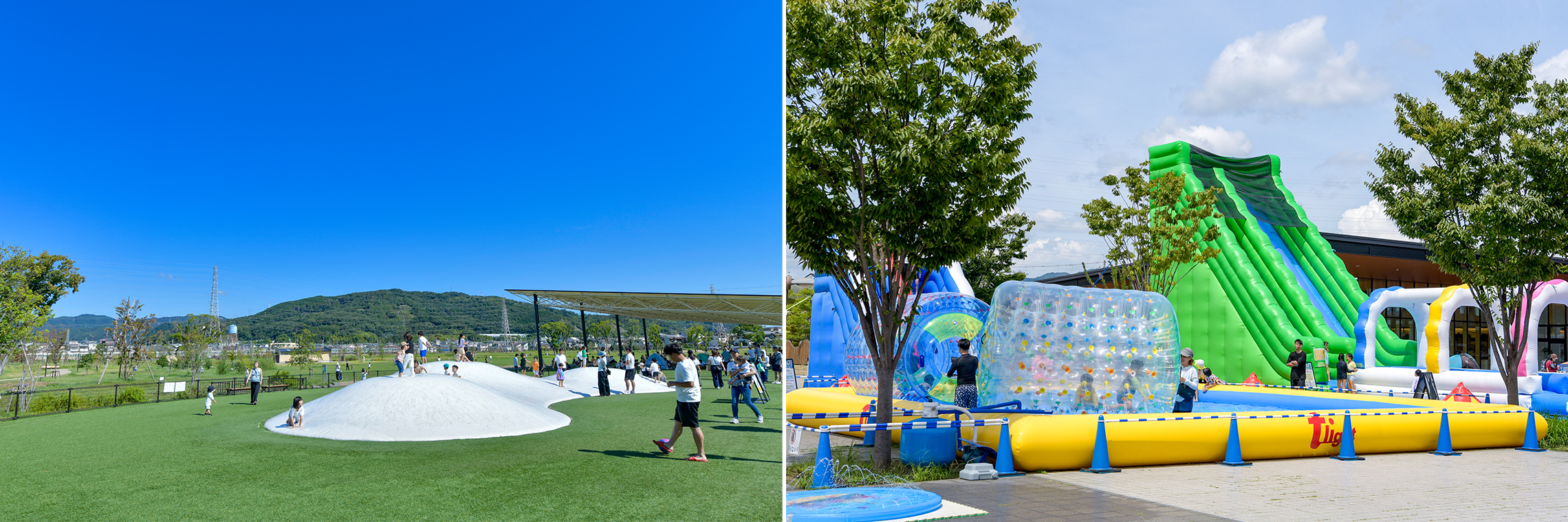子供たちが喜ぶダイナミックな遊び場や遊具があり、一年を通して多くの家族連れで賑わう「安満遺跡公園」。園内西エリアの「ボーネルンド プレイヴィル」は、「世界のあそび道具」の販売で有名な「ボーネルンド」社が運営する子供の遊び場。屋内外一体型で、天候に左右されず利用できます。東エリアの人気は「ふわふわドーム」。大きな膜状のトランポリンです。